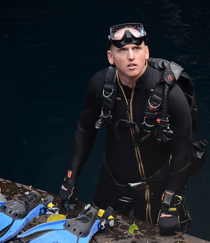 Josh, in his capacity as producer, host, model, and frequent videographer, did not rest much during his time in the field. Along with the topside shots, Curt and Jeff shot underwater, typically with two models and two divers acting as light monkeys. In a cenote with multiple openings, Curt hung fifty feet above the surface of the water in order to shoot multiple divers rappelling and climbing into the cenote. After all the divers were submerged, which was fifteen minutes after he had lost total feeling in his legs, Curt climbed out using his frog climbing system. All of the ADM Exploration Team explorers use this type of climbing system in which components are worn under the Armadillo side-mount harness.
