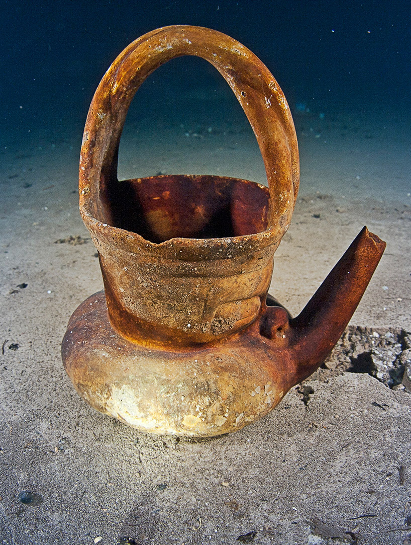 Above: The prize discovery of the expedition was this 1800-year-old ceramic vessel with a braded handle. Used to froth chocolate, this is only the second ceramic vessel ever discovered with such a handle. Note the carved eyes and nose above the pour spout. |