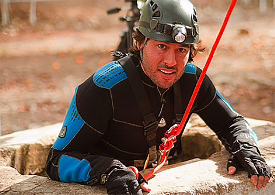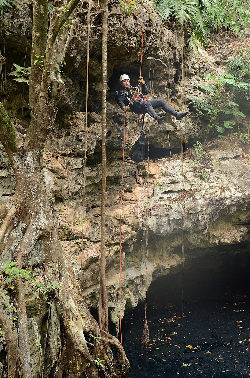 Left: Josh Bernstein, host of the History Channel’s “Digging for the Truth” and Discovery Channel’s “Into the Unknown,” prepares to rappel through a village well shaft into an unexplored cenote. Photo by Jon Bojar |