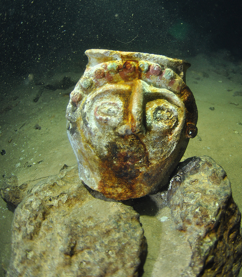 Above: A second ceramic vessel discovered has a design of a face and painted surfaces. This vessel was discovered on the opposite side of the Cenote along side a couple sections of human remains. |