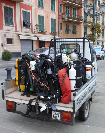 When we intended to reorganize an expedition to the wreck of the U455 with the Dir-rebreather team only 2 teams were on the wreck before us. As with former expeditions Pim Van Der Horst brought an international group of technical divers together to realize the dive. The team was made up with divers from Portugal, Croatia, Italy, Netherlands, Germany and France. They were all experienced rebreather divers with years of experience. Our base was Santa Margarita Ligure, a little village nearby Portofino. Bruno had his divers centre here, as well as a good boat to realize the voyage to the wreck. As the weather was bad, with high wind, Bruno informed us that we had to delay the dive. The only thing we could do was to be patient for a few days. When the weather cleared up and the wind died out on the third day our units were already ready and the teams could be sorted out. The first dive I would make in the second group was with Armando Ribeiro and Oscar Corna. After talking over the divers plan and the bail out procedure we were ready to dive and the boat was loaded with hundreds of kilos of diving material and cameras. |