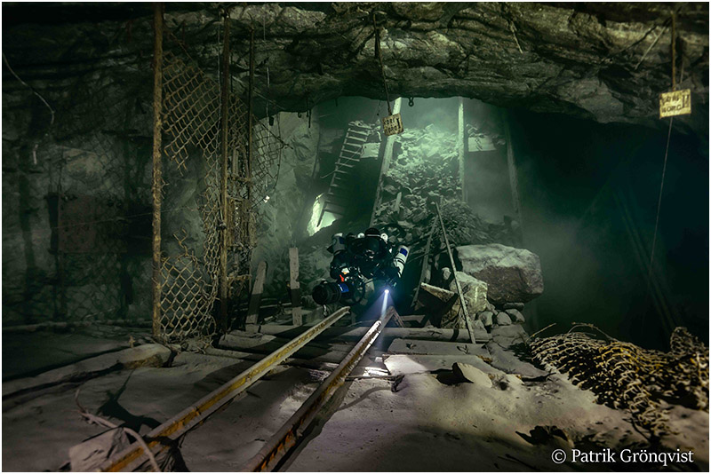 Ojamo Mine – 58 m Level, Connection Aisle – At the 58-metre level of the flooded Ojamo mine, a diver passes through a collapsed connection aisle where broken rock, fallen timbers, and hanging cables testify to decades of industrial use before abandonment. Ojamo was once one of Finland’s most significant limestone mines, supplying raw material for cement production throughout the 20th century. When operations ceased and pumping stopped, the mine gradually flooded, preserving haulage routes, stopes, and access corridors beneath cold, dark water. In 4 °C conditions, careful buoyancy and controlled propulsion are critical as fragile sediments and unstable structures surround the passage.