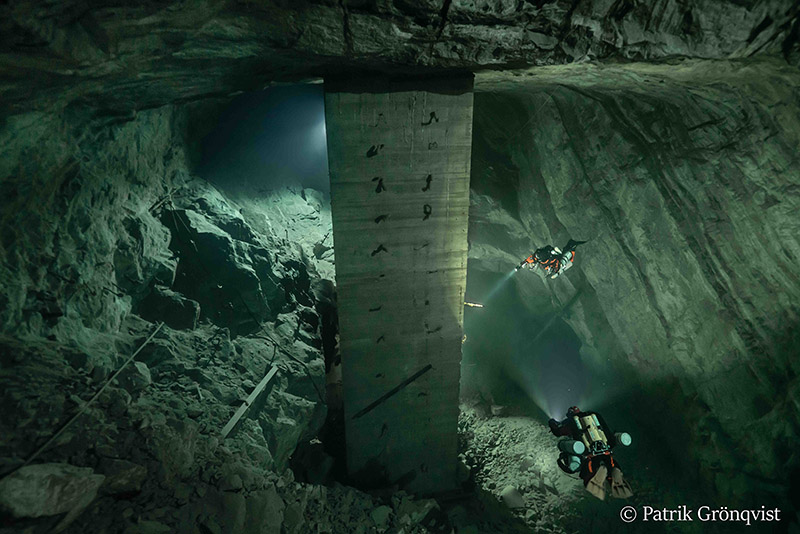 Montola Mine, Montola Mine — Finland — At the 90-metre level of the flooded Montola Mine, two technical divers move through a vast, silent chamber where industrial geometry meets raw bedrock. Illuminated beams reveal steep rock walls, collapsed mine debris, and the immense scale of the excavation, emphasizing the depth and isolation of this cold, overhead environment. At 4 °C, the water preserves both the mine’s structure and its atmosphere, while precise buoyancy and controlled movement are essential at this extreme depth.