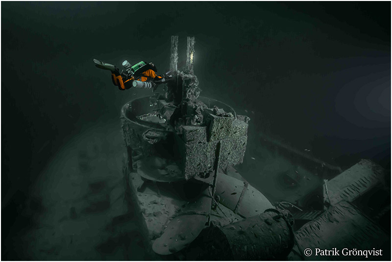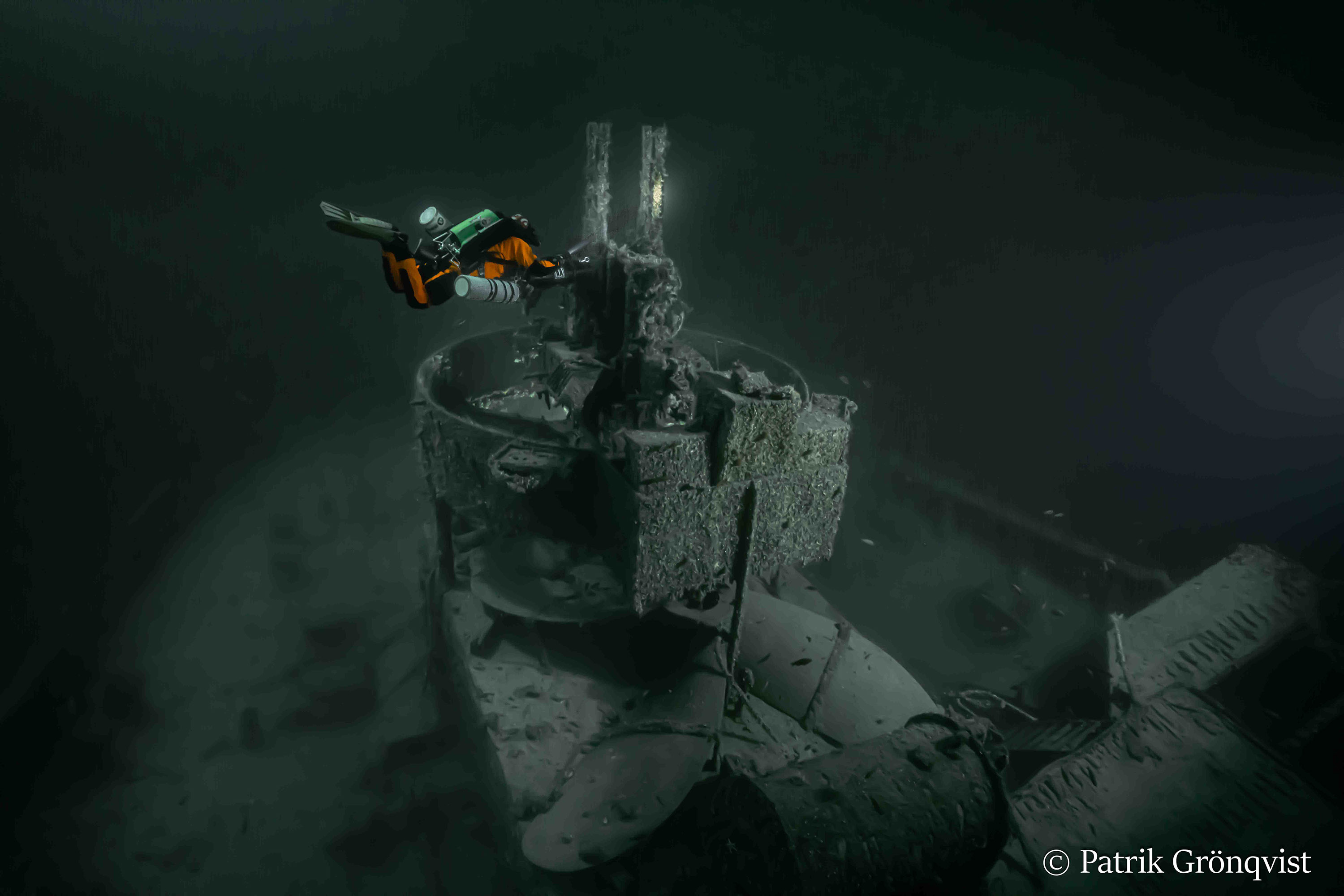 ORP Grom — Polish Navy Destroyer, Narvik, Norway — A technical diver pauses above one of the large deck guns of the Polish destroyer ORP Grom wreck, resting in the darkness of Ofotfjord at 90–110 metres depth. Once trained on enemy ships and shore positions during the fierce fighting of the Battle of Narvik in 1940, the gun now points into silence, its barrel encrusted with decades of marine growth. The scene captures the transition from wartime violence to stillness, as the wreck endures as a protected war grave in the cold Arctic water.