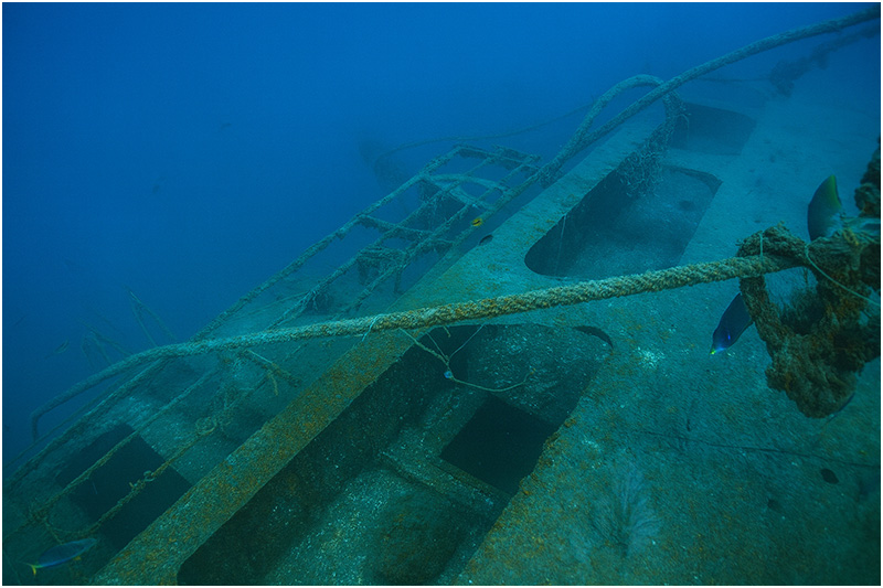 Railing still adorns the perimeter of the wreck. Swimming towards the stern, numerous hatches permit access to the interior. Divers can follow rows of portholes aft until eventually encountering the large single screw on the terminus of the sloping hull. Crossing back over to the upper decks, machinery and booms provide a unique scene near the fantail, while large hawser lines float 50 feet upwards from the wreck. These lines used to float on the surface for several years, which helped to expedite the location of the wreck.