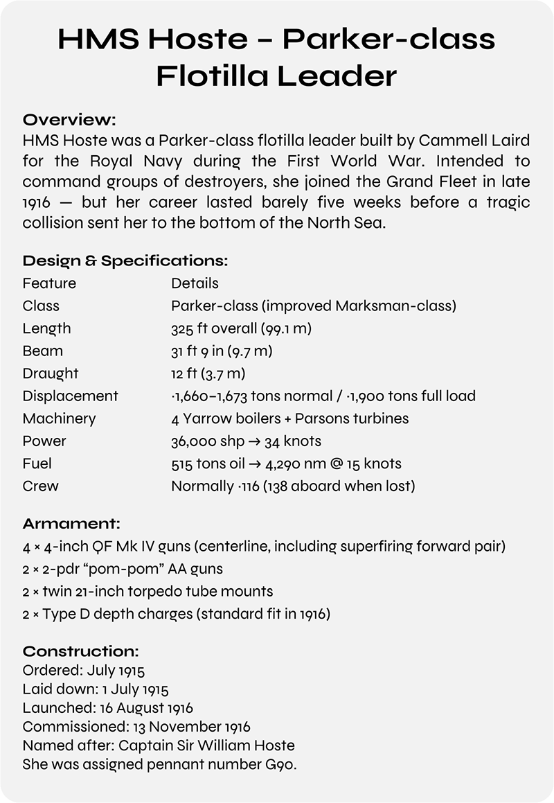 The night the ships collided began, as nights often do, with confidence. Confidence was useful at sea, especially in December, especially in the North Sea, and especially when surrounded by other confident men aboard other confident ships, all of them convinced that steel, procedure, and habit could out-argue weather. Confidence was also fragile, which was why the sea enjoyed it so much. HMS Hoste was new enough to believe in herself. She still smelled faintly of fresh paint and untried machinery, and her crew spoke of her as if the present tense were guaranteed. She was a flotilla leader, which meant she was larger than the destroyers she commanded and therefore assumed she was wiser. She could make thirty-four knots if asked politely, her guns pointed exactly where they were told, and nothing significant had yet gone wrong. Behind her steamed HMS Negro, smaller, a little older, and less inclined to optimism. Negro had already learned that the sea did not care what you were for or how recently you had been completed.