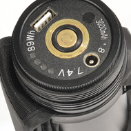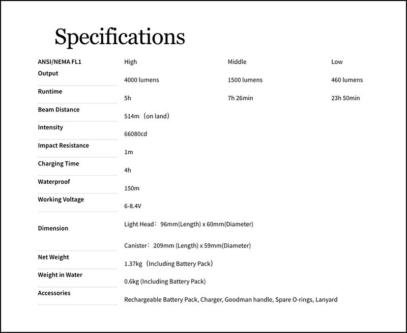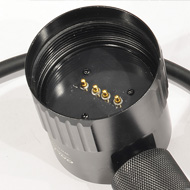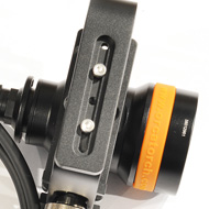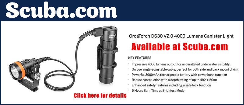 The Orcatorch D630 V2.0 is just such an example of today’s miniature canister style dive lights with a goodman style handheld lighthead. The diver can easily attach the small canister in any position, from the waist strap to across the back of the harness. Its small canister size virtually makes it unnoticeable while the heavy-duty cord easily routes to the divers’ hand or, if desired, helmet. The three position brightness option switch provides continuous light from 5 to 23 hours on a single charge with 4000 to 460 lumen output. |