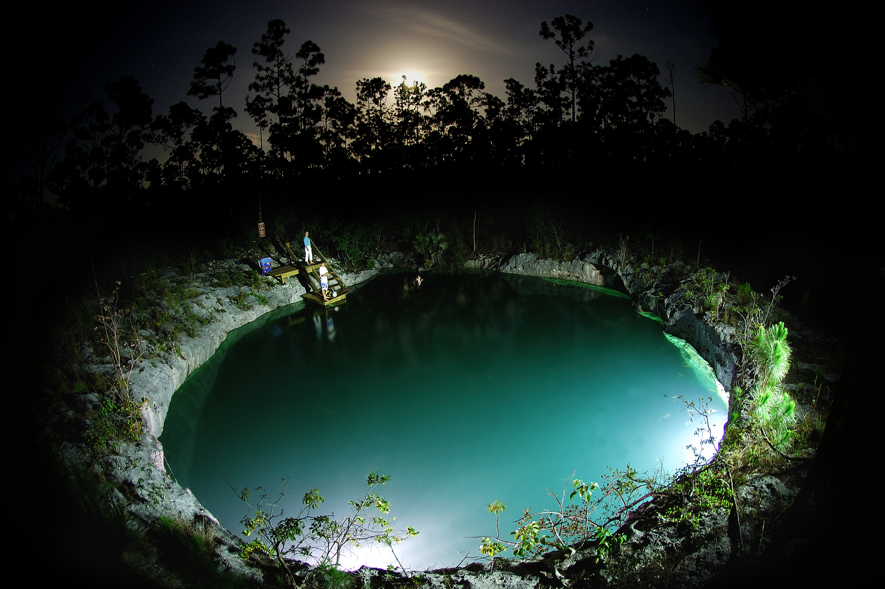 Above: The full moon rises above the Abaco pine forest as divers illuminate the greenish waters of Sawmill Sink.