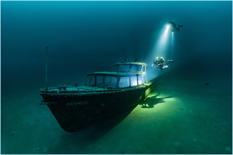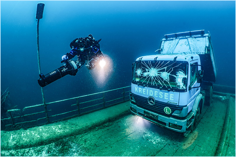 With a small camera system, I became involved with underwater photography in the early 1990s. The fantastic visibility and the impressive scenery of the walls and structures in the „See im Berg“ made me intensifying my photography ambitions. The Sunlight beams and long shadows can create spectacular impressions under water, so I kept this aspect in focus. Over the next several years, with the help of my sister, who is an educated photographer, I improved my photography skills.