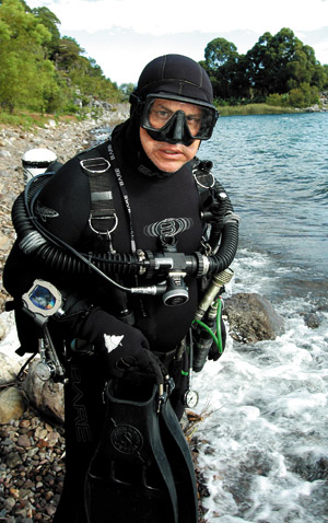 Left: Team coordinator Keith Ambrose, sporting his Evolution rebreather (which he refers to as the Cadillac of CCRs because it contains all the bells, buckles, straps, and whistles), prepares for another exploration dive into Lake Atitlan. |