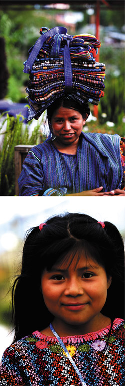 Above right: Dressed in customary garments, a local Mayan girl from the lake city of San Pedro sells her wares to visiting tourists. With a smile and determination, she quickly softens the hearts and wallets of several team members, leaving us standing in the middle of the bustling stone street seemingly dumbfounded, conjuring up excuses. We quickly determine that all purchased items were intended for our wives and children all along.