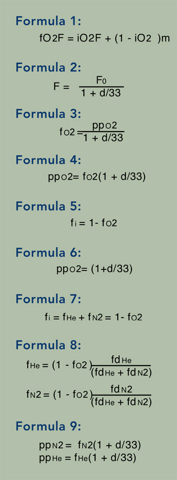 Mixed gas CCRs allow deeper excursions than pure oxygen CCRs by diluting the breathing mix with inert gases, notably nitrogen and helium. Fresh oxygen is injected into the breathing loop only as needed to compensate for metabolic oxygen consumption. Partial pressures of oxygen are measured in the loop with oxygen sensors, and oxygen is injected to maintain constant oxygen partial pressures called the set point. Operationally, mixed gas CCRs are simpler to use than their sisters, mixed gas SCRs. Efficiency and safety concerns obviously track directly to oxygen sensors. Mixed gas CCRs maintain constant oxygen partial pressures, ppO2, with a combination of diluents and pure oxygen. The oxygen fraction, fO2, varies with depth, (see formula 3) and the breathed total inert gas fraction, fi, makes up the deference, (see formula 7) for the general case of helium and nitrogen diluents. The oxygen, helium, and nitrogen breathed gas fractions, fO2, fHe, and fN2 vary continuously with depth, d. If the (fixed) diluent helium and nitrogen fraction are denoted, fdHe and fdN2, the breathed helium and nitrogen fractions become (see formula 8). Partial pressures at depth for the inert gases are then simply, (see formula 9) and the oxygen partial pressure, ppO2, is constant.