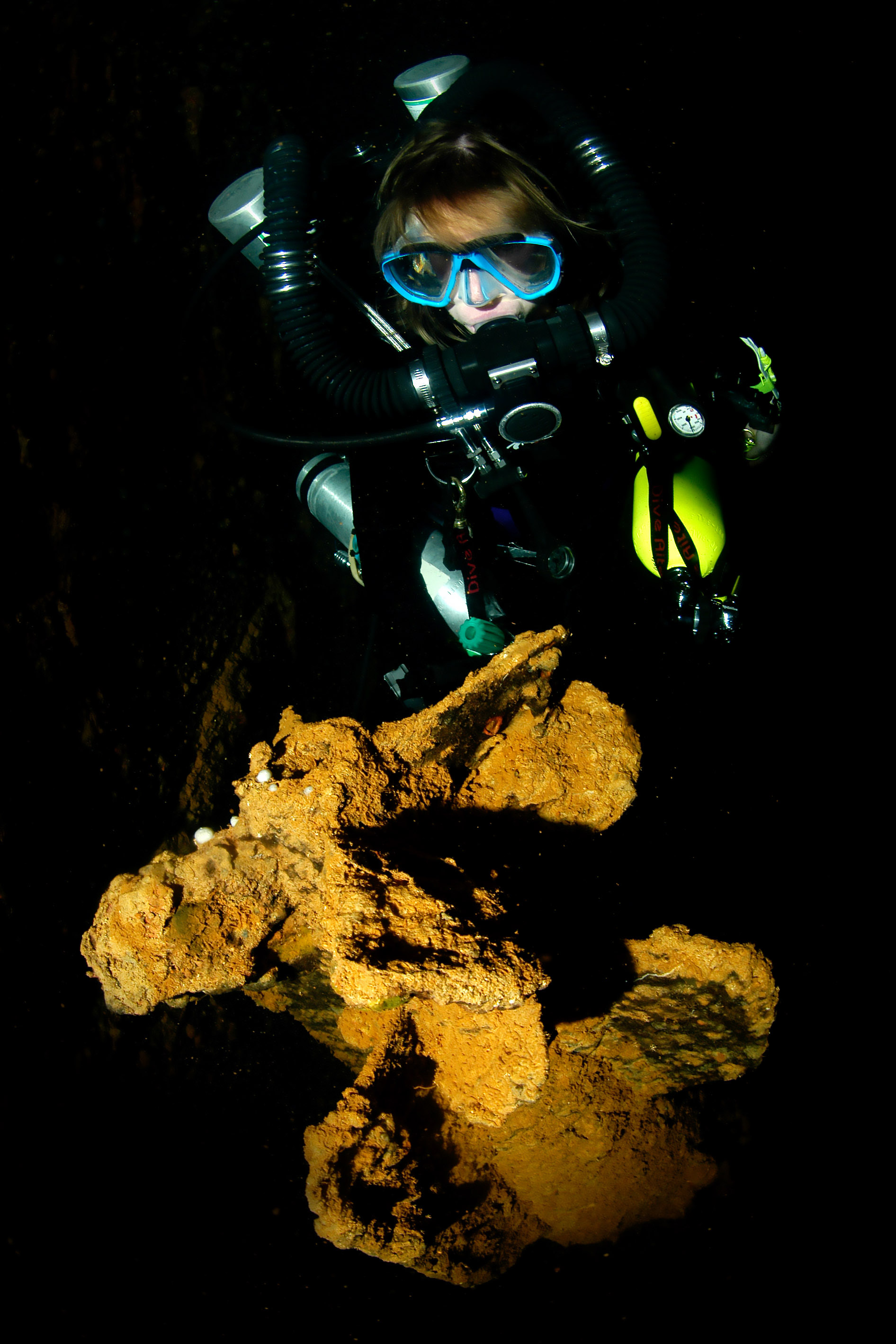 Above: CCR diver Ron Benson illuminates a large air