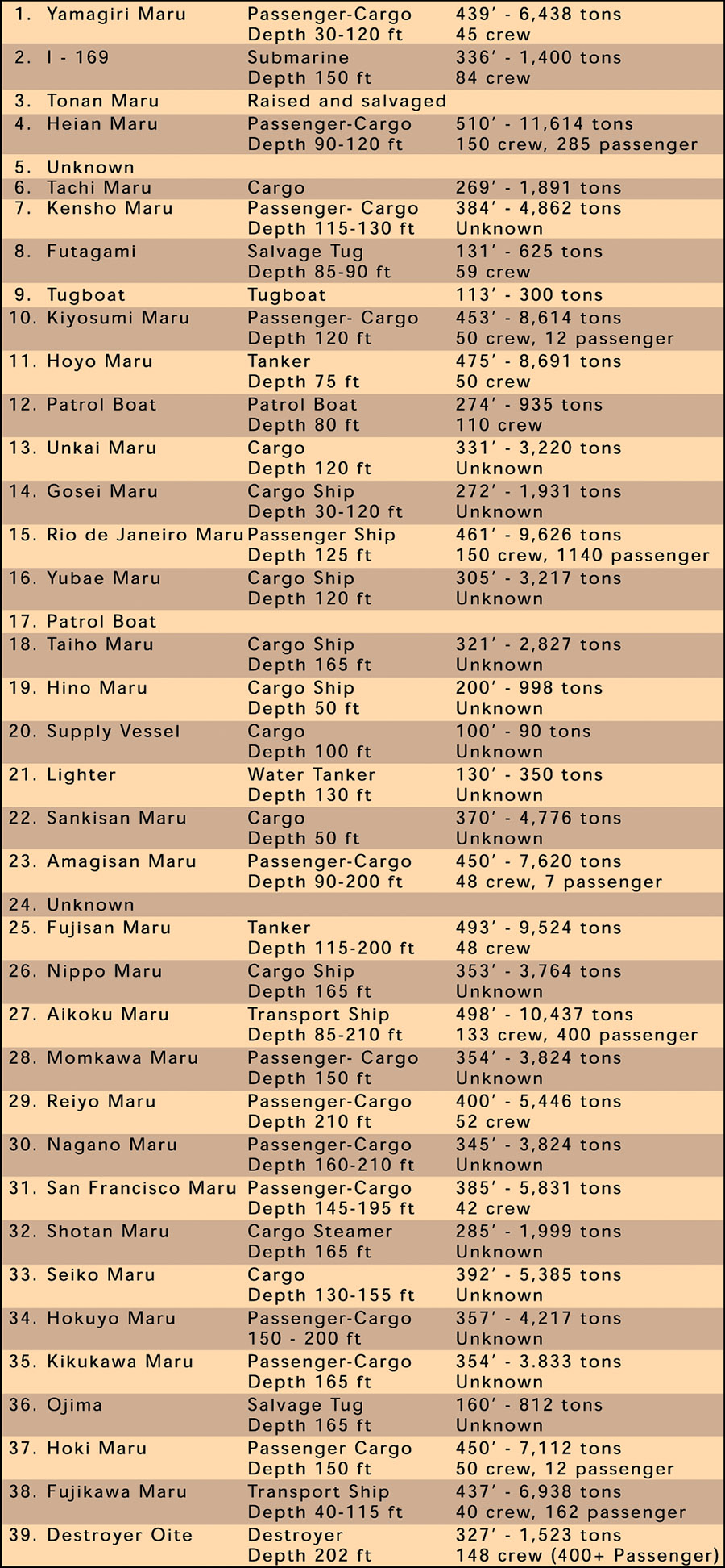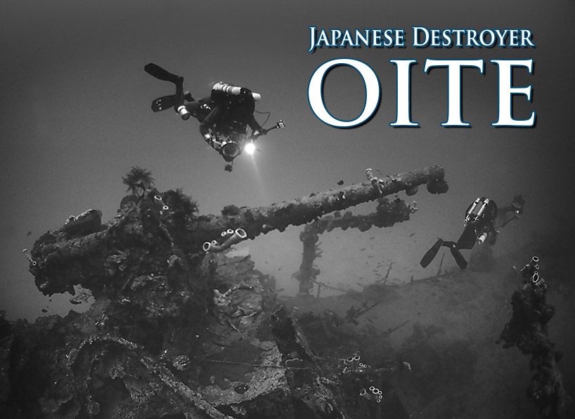 Due to its distance from the main diving wreck zones and increased depths, the Oite is seldom explored. As the Oite split in half during the sinking, the section from just aft of the pilothouse to the bow turtled and smashed hard into the sand floor, crushing all the superstructure and deck guns underneath the hall. Tilted slightly to the port side it is possible to squeeze up underneath the bow section and into some of the bow sections. The forward bow torpedo explosion is easily seen from the massive hole and destruction. The stern of the Oite from just aft of the engine room sets upright on the sand floor. The main deck sets at 180 feet with the sand at 202 feet. The Oite has twin brass props half buried in the sand. Antiaircraft guns and a large main battery gun points towards the sky. Lifeboat davits and a depth charge rack can be examined on top the deck.