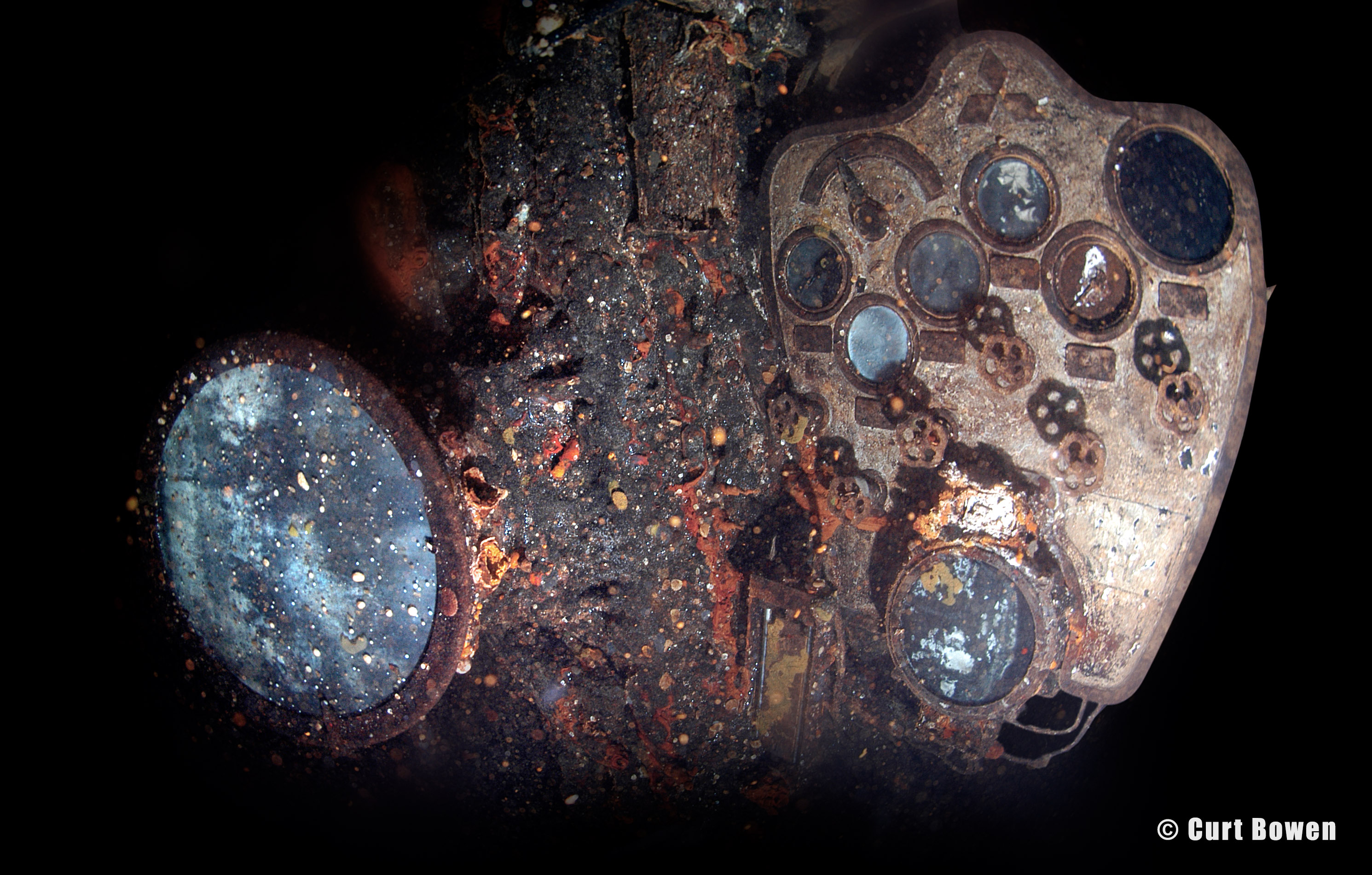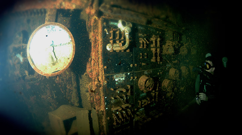 Above: Exploring deep into the third engine room level of the Heian Maru, CCR diver Ron Benson discovers this engine room telegraph and engine pressure gauge panel.