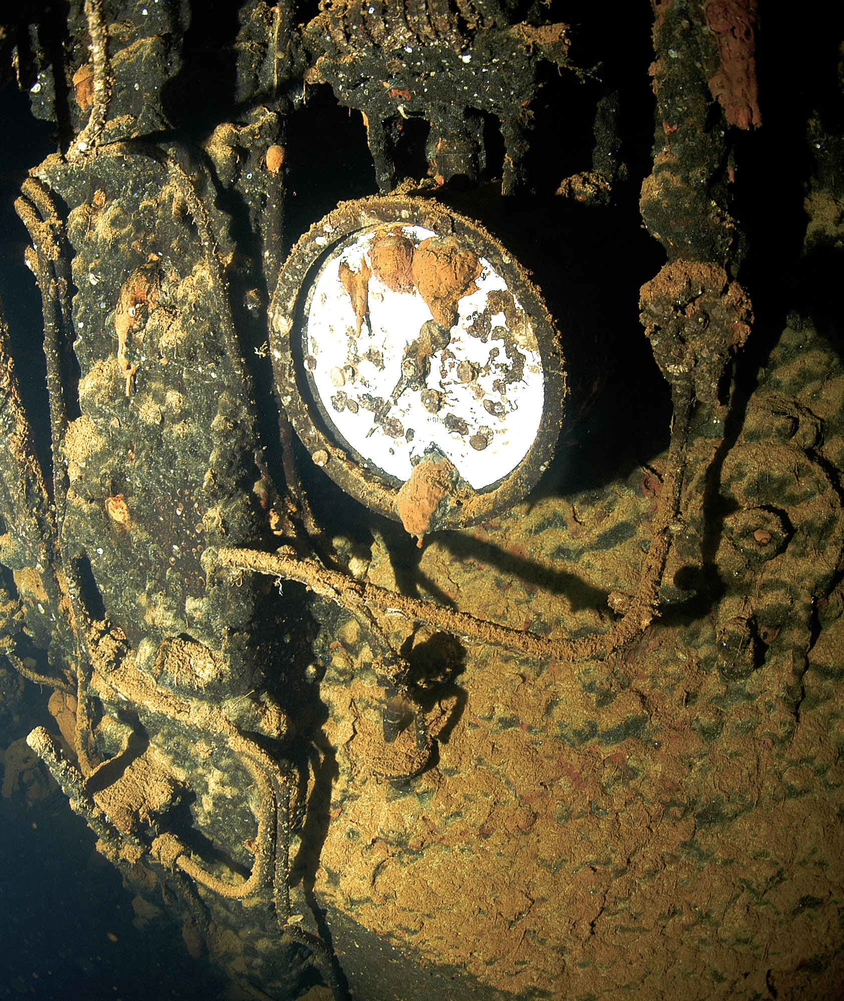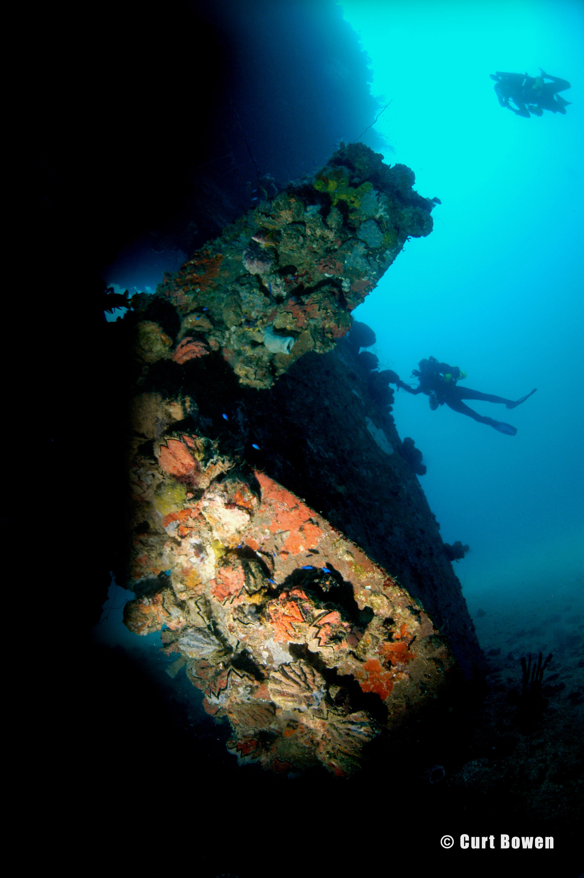 The starboard side of the ship is covered with soft corals, sponges and an array of marine life. |