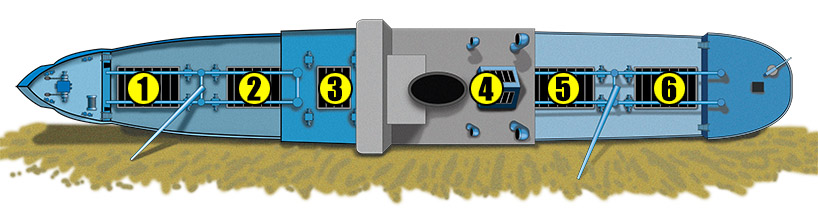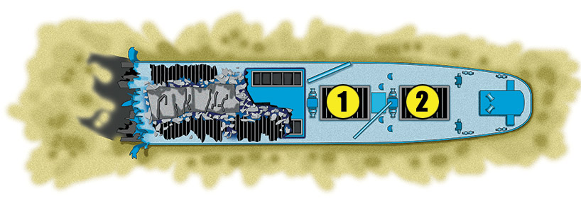 Cargo holds number 4 and 5 are mostly empty except for some artillery shells. The area of cargo hold number 5 has received major damage from the 1,000 pound bomb explosion.