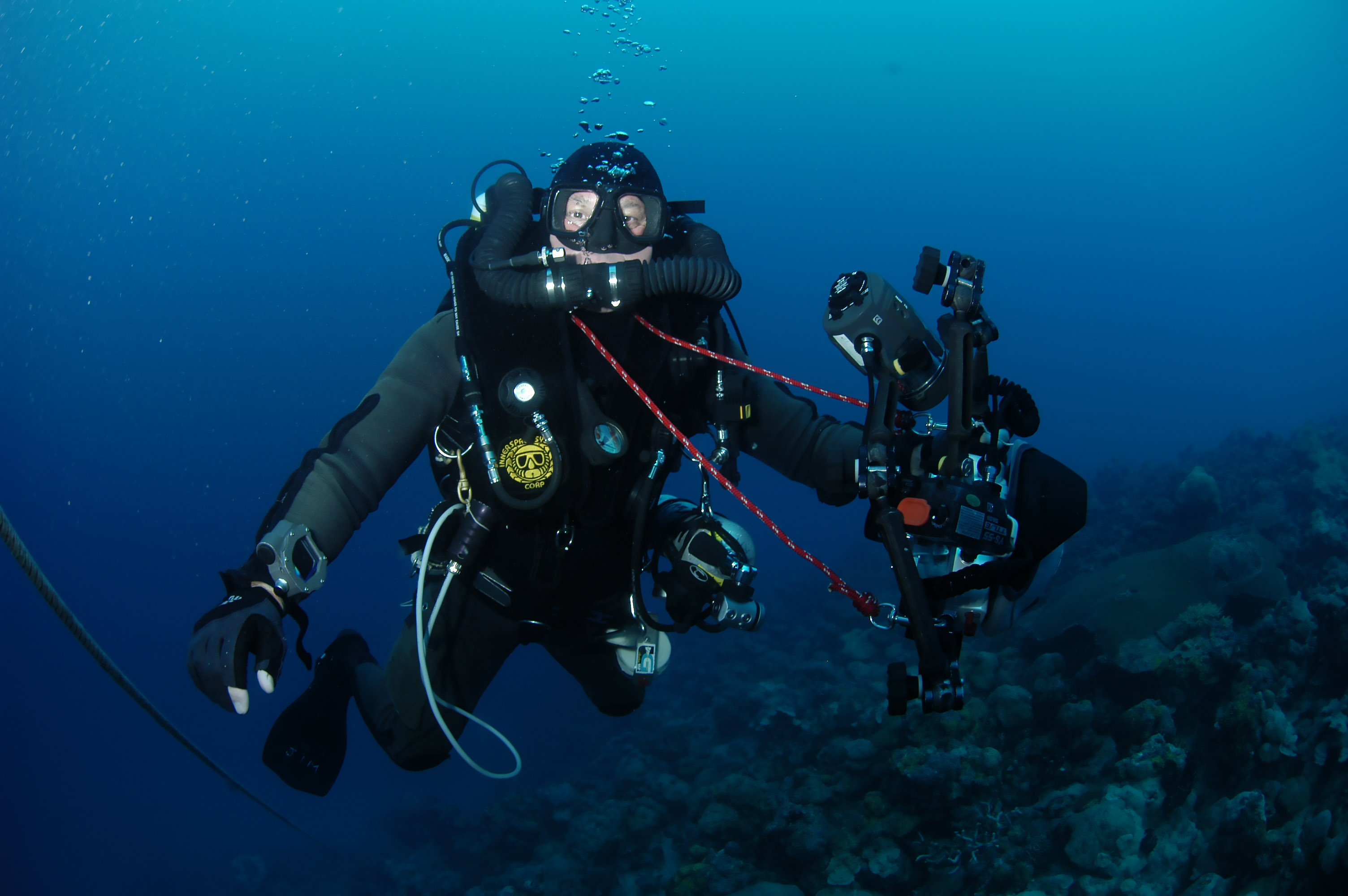 Below: Meg CCR diver Jim Rozzi and underwater camera set-up. |