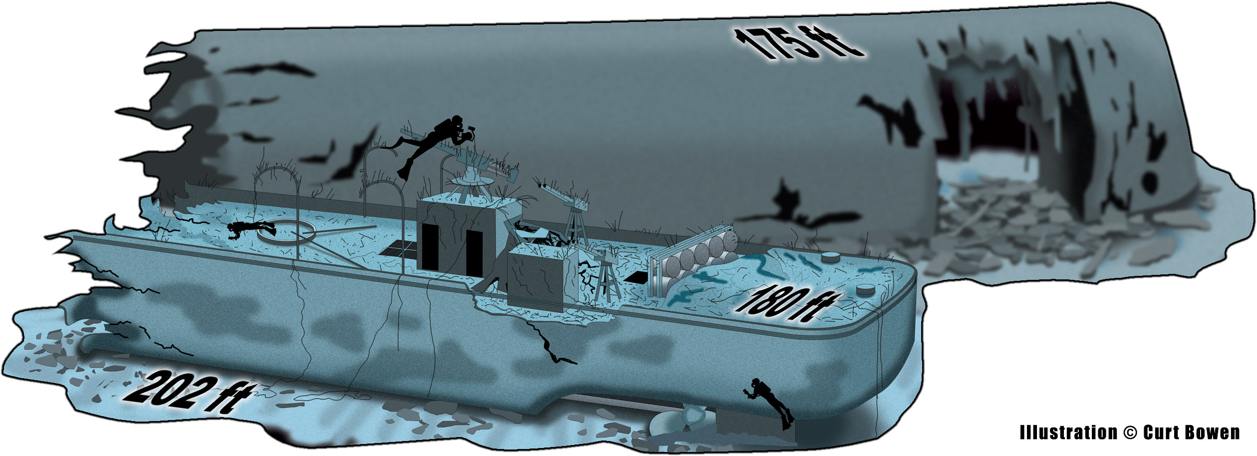 Above photo: The stern section sets upright at a max depth of 202 feet.
