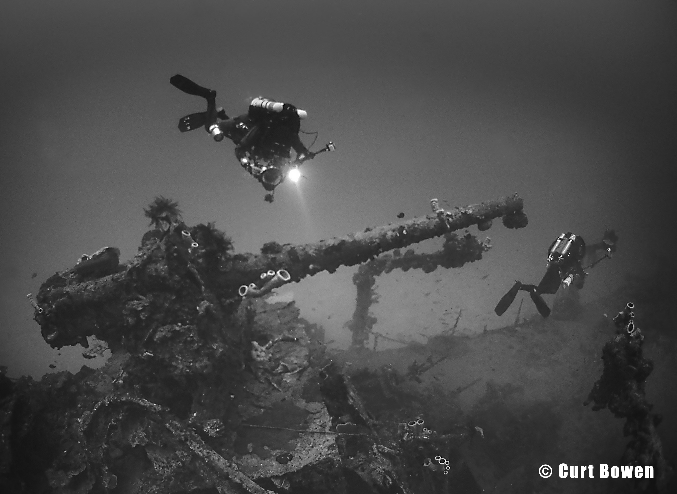 Above: CCR divers inspect the stern section of the Oite. Max depth 202 feet.