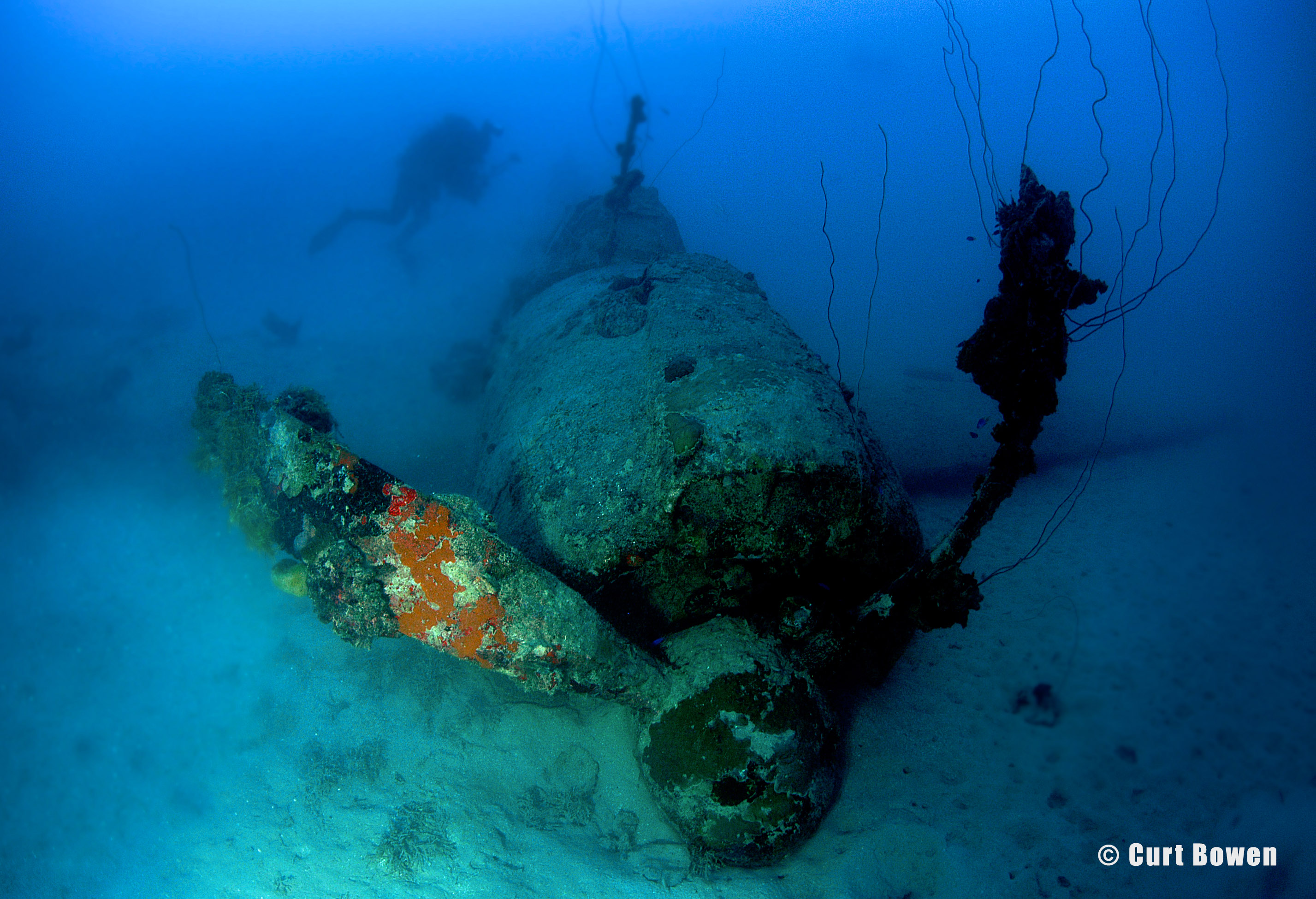 Above: Japanese torpedo bomber “Jill” sits in 120 feet just off Eten Island