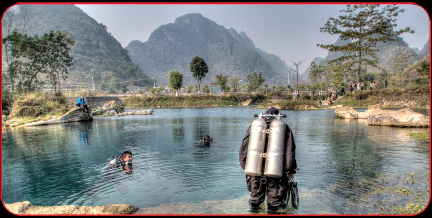 Student diver prepares for a training dive into Daxing cave.