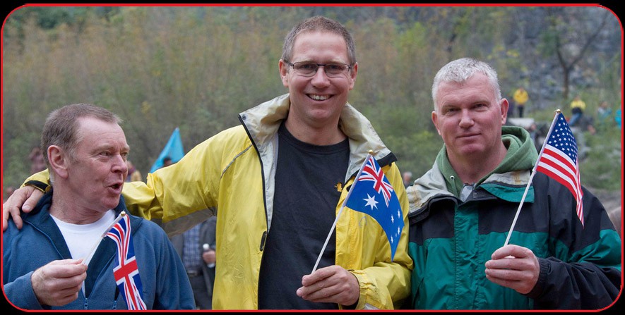 Martyn Farr, Richard Harris and Curt Bowen wave the flags of their countires