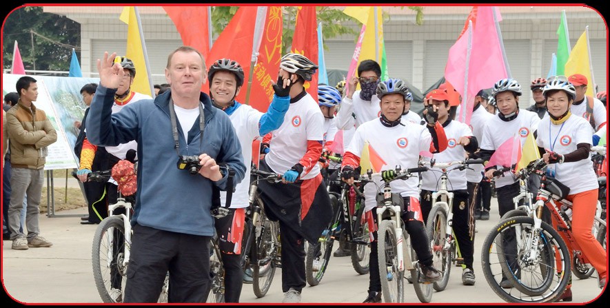 Martyn Farr stands in front of the Du’An bicycle club as they prepare to ride around the city celebrating the opening of the new technical dive center.