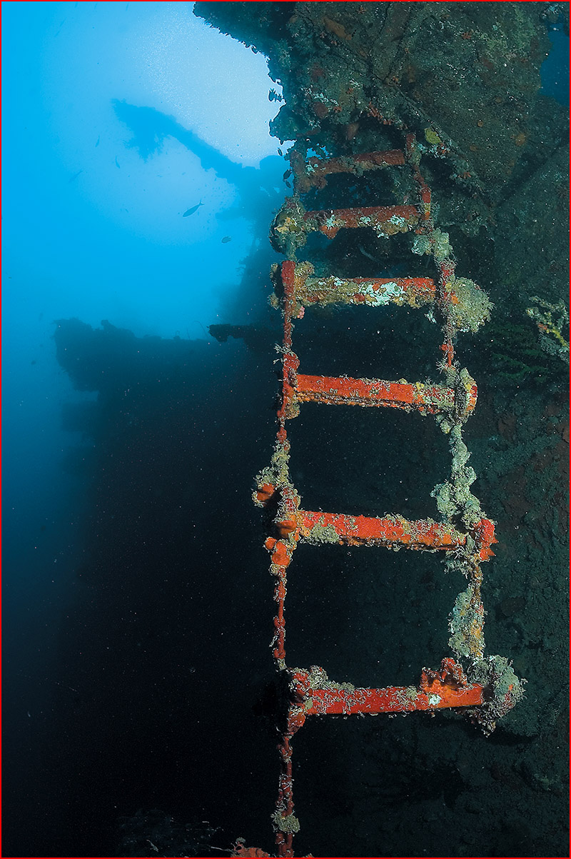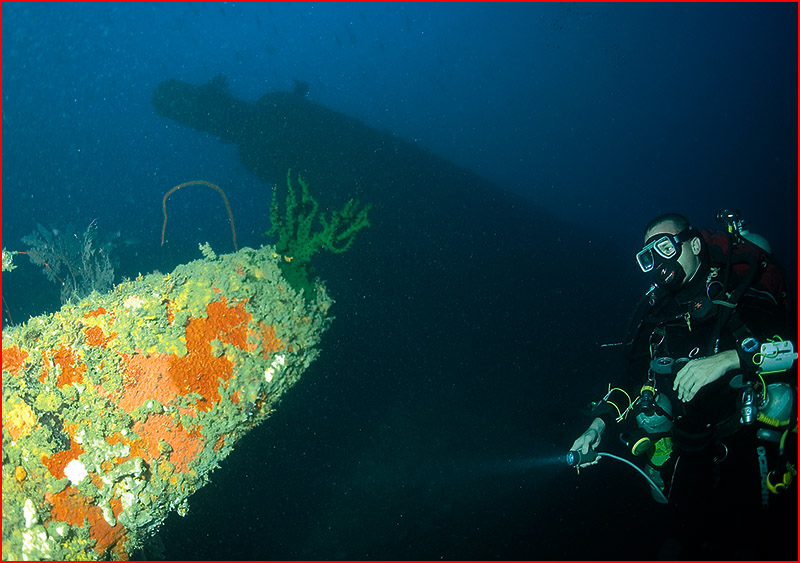 Barry Holland at Aquamarine has become an invaluable partner in my quest to explore and photograph the stern area of this massive ship. Barry is a TDI trimix instructor and has done thousands of dives on the wreck. Aside from the legendary Alan Power, Barry knows the ship as well as anyone. His passion for technical diving makes him the logical choice for any visitors who wish to dive beyond recreational air limits. Barry and I have a small cache of helium in Luganville, which goes a long way in the two-liter diluent tank on the KISS.