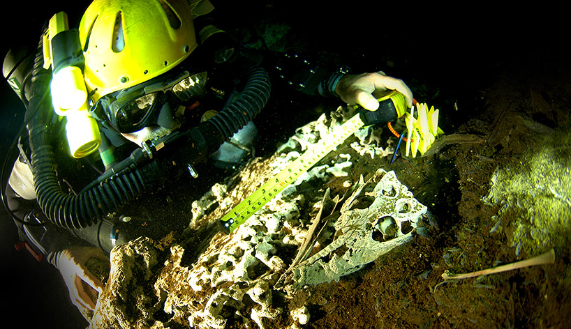 Brian Kakuk measures a large crocodile skull located just below the hydrogen sulfide layer. |