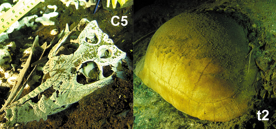 A few months earlier, I had been cave diving with Jim Pickar on Great Abaco Island in the northern Bahamas. During a dive in one of the inland sinks, we had discovered some very old looking crocodile skulls and two huge land tortoise shells on the thick peat covered talus mound of the cave opening.
