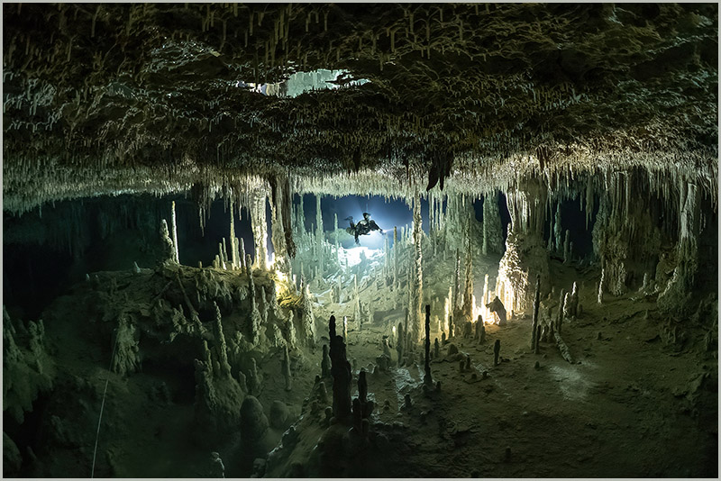 My first cenote dive was at Dos Ojos, and the moment I dropped below the surface, my life changed. A clear, blue tunnel twisted off into the distance. Sparkling white sand covered the floor of the cavern, thin, delicate stalactites adorned the ceiling, and massive columns rose like trees around me. Almost out of sight, I saw two cave divers in doubles swimming off into a dark hole. What was around that corner? Where were they going? I needed to know.