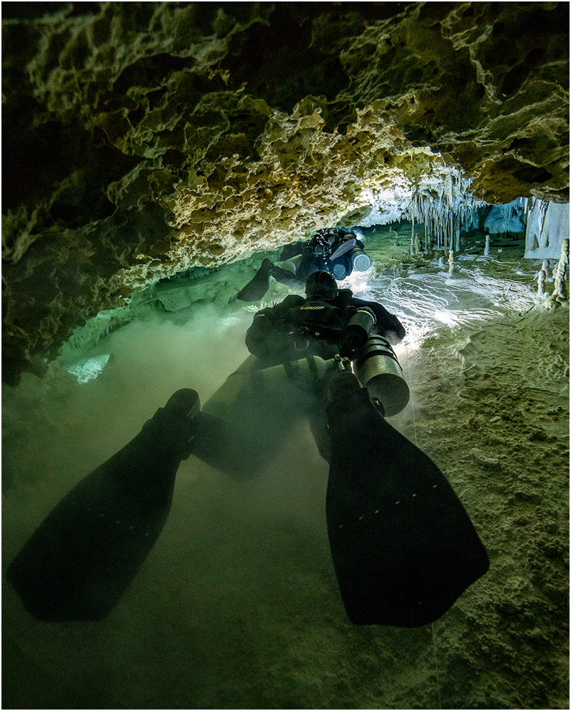 Above: Cenote Chicken, now called in an unpronounceable Mayan name, has some side tunnels where one must drag themselves through, capturing the CCR divers crossing one of the many more narrow passages.