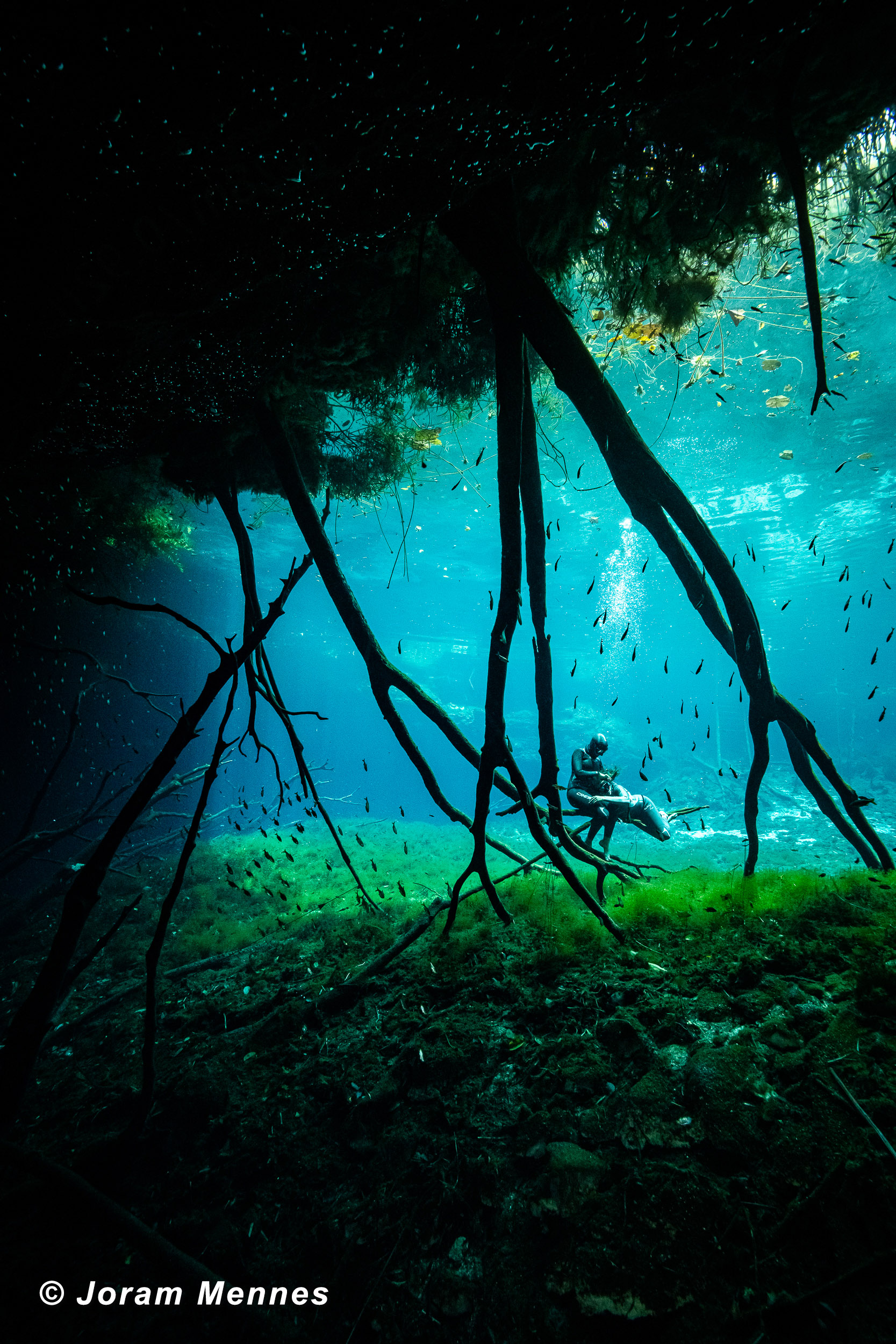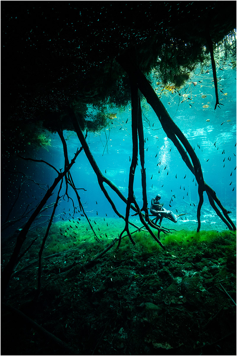 Below: Cenote Carwash, after strong rains turns red/orange/green, it had been raining the previous days, and we were all set for amazing colors, but upon arrival the water was crystal clear, still we made our plan and went along with it, toward the end of the session, they descend and sat on this branch, captured a moment that for me reflects the peace one can find down there.