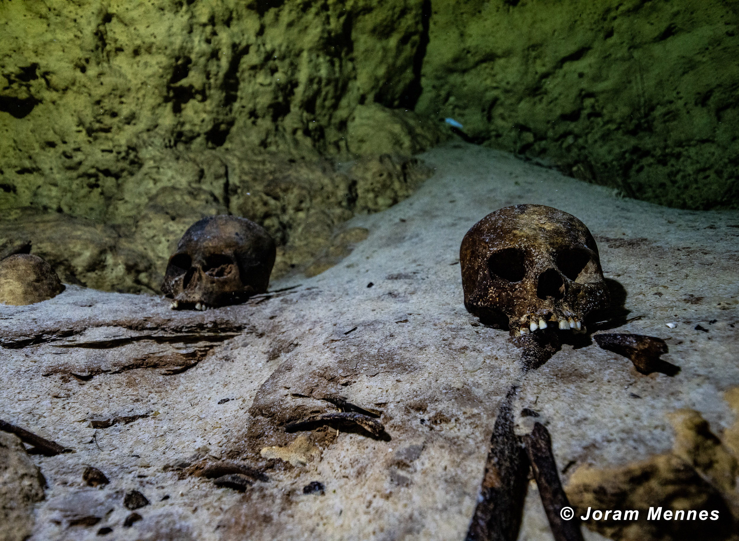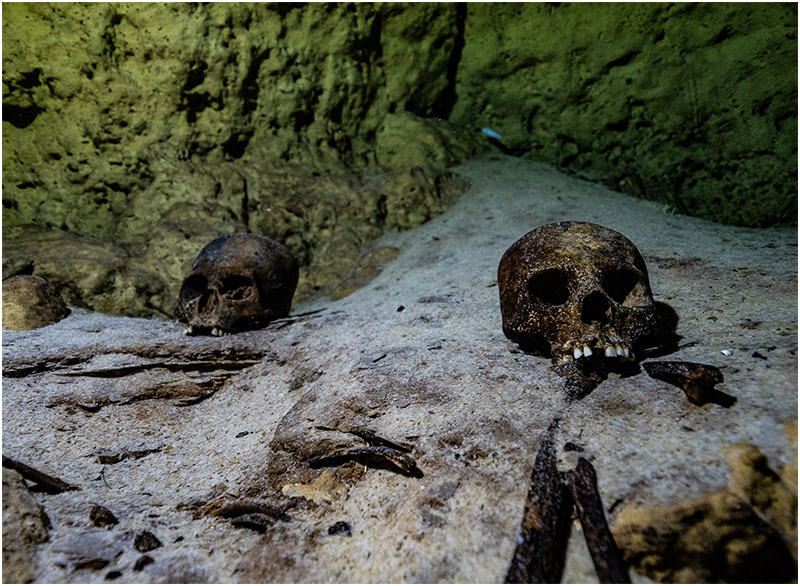 Below: Cenotes In Homun, a early morning start at 4 am, and a 5 hour drive took us to this far away remote village, meeting our sherpas and helpers and a drive to the jungle, stopping to cut the branches with machete and crossroads id never remember left or right, we arrived at this abandoned Hacienda, using rope and rappel, we descending into this Pit style Sinkhole, were we saw more than 30 Skulls and Bones, these pair were captured on a ledge, best models ever, motionless as if time did not pass, looking at me, I got this memorable image, makes me want to return to discover more of these places.