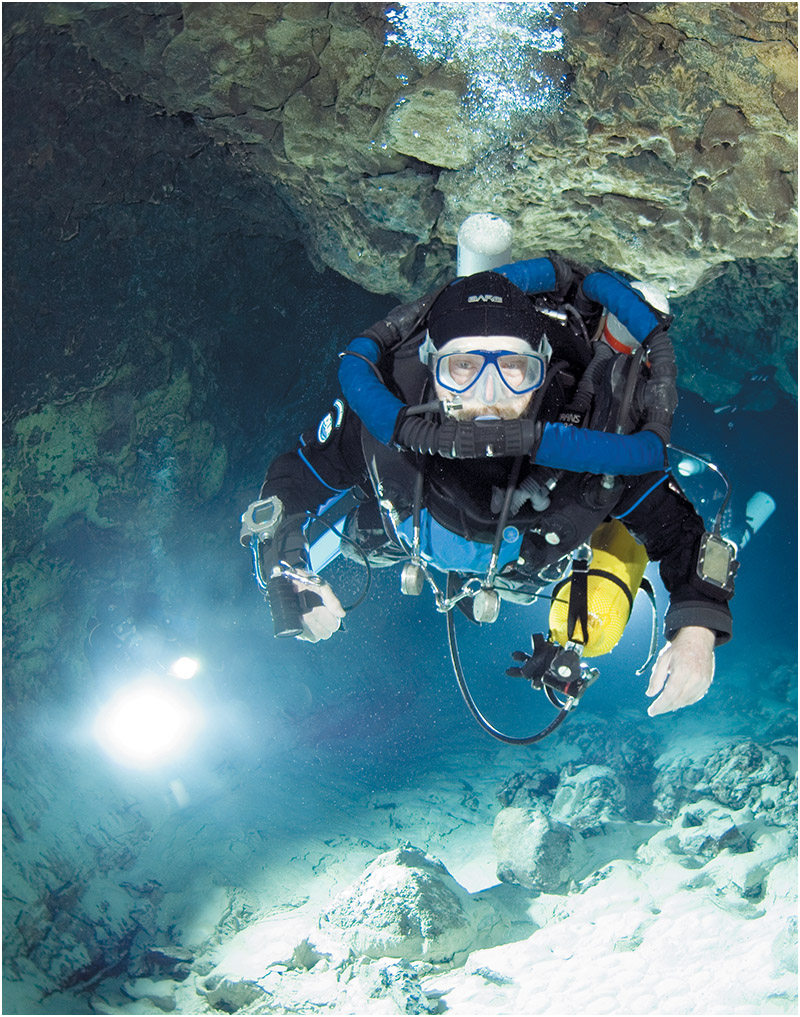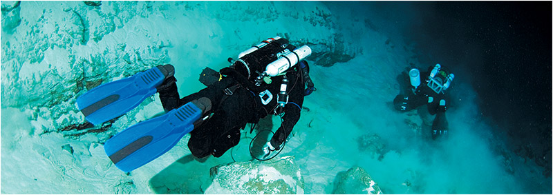 Below: Dr. Tom Iliffe dives a Megalodon rebreather as a matter of conservation, leaving athe water chemistry minimally affected by our presence.