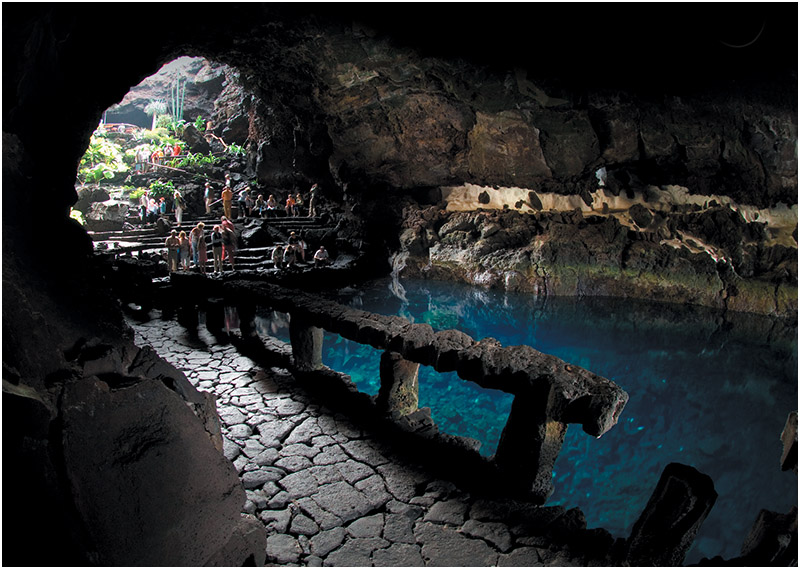 At this stunningly beautiful location, the Lanzarote-born artist Cesar Manrique has magically blended the stark volcanic landscape and blue water of the cave with artistic features including an extensive museum on vulcanology. A natural auditorium space can seat 600 and is renowned for its excellent acoustics. The overall beauty of the surroundings is filled with gentle, new age music inspiring visitors to whisper as they walk reverently through the cathedral-like spaces beside the Jameo Chico Lagoon. Dotting the black volcanic rock like twinkling stars, blind albino crabs (Munidopsis polymorpha) are found in this lagoon and nowhere else on earth.