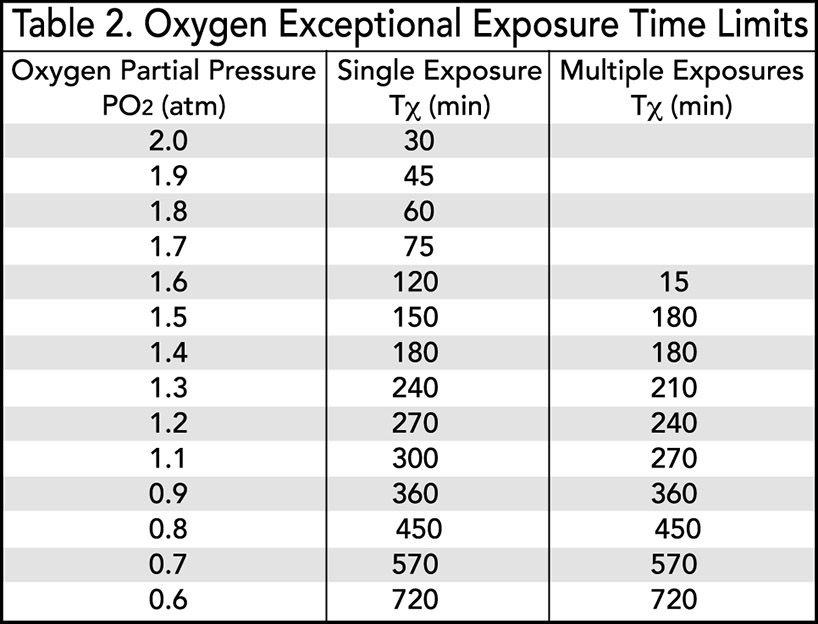 Note the severe reduction in multiple oxygen exposure time at 1.6 atm in Table 2. For this reason, technical divers generally restrict mixed gas diving exposures to PO 2 < 1:6 atm through- out any sequence of dives.