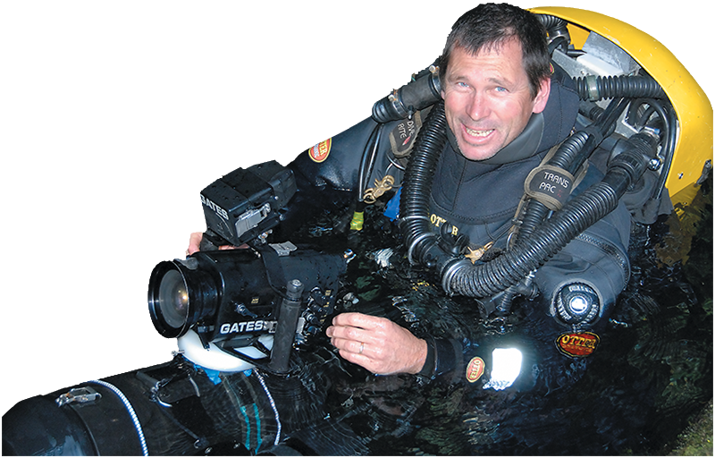 | Above: Dave Apperley in the entrance pool, armed with scooter, 200W HMI light and video |