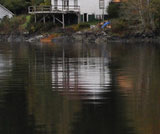 | Photo: The small white house with the red roof was originally the home of the Perry brothers who moved to this site in the Tahsis Narrows when their homestead at the mouth of the Leiner River became too crowded when the Tahsis sawmill was built in 1947. The buildings in the centre of the photo are the old Canadian Packing Corporation pilchard cannery built in 1926. |
