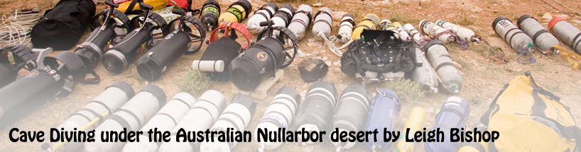 | Cocklebiddy is regarded as the Mount Everest of cave dives in the southern hemisphere and only a handful of experienced and trained cave divers venture into the magnificent sump two. The cave is broken down into three dives; sump one which is 1.2km in length and runs from the lake to a rock pile air chamber. The diver then has to take all of their equipment off and carry it over a 100m of collapsed rocks before descending down the rocks again to sump two. The spectacular sump two is 2.5km in length before it arrives at Toad Hall where the diver once again removes all of their equipment and carrys it over to sump three, a distance through varying chambers of 220m. Sump three is approx 1.7km in explored distance of which 1.2km is reasonably large and easy going before it closes down a lot smaller but still large enough to swim through with back mounted diving equipment. The diver then gets to approx 1.5km into the sump where the passage then becomes to small and tight to swim with a back mounted system. From here the way on becomes a side mount equipment dive then only after approx another 100m or so the passage becomes even smaller, enough for the size of a diver to fit in and hence a No Mount dive i.e. the divers has to push whatever it is he or she is breathing from in front of them! Of course if you are at this point the likelihood is that after a distance of 5.7km into the cave youre not using conventional scuba. The push divers on this expedition were using a variation of their own home made rebreather configurations, which run in considerably smaller in size than a standard manufactured unit. These where transported to the far end of the cave before being used for the final pushes. |
