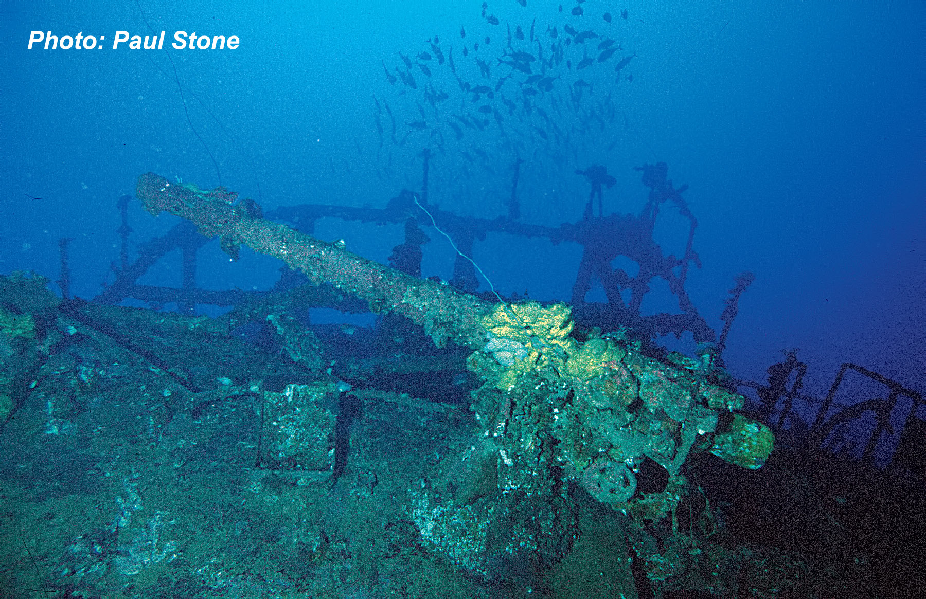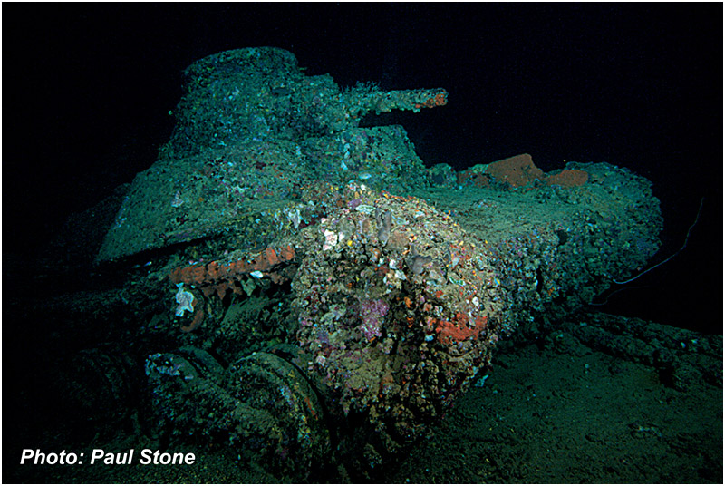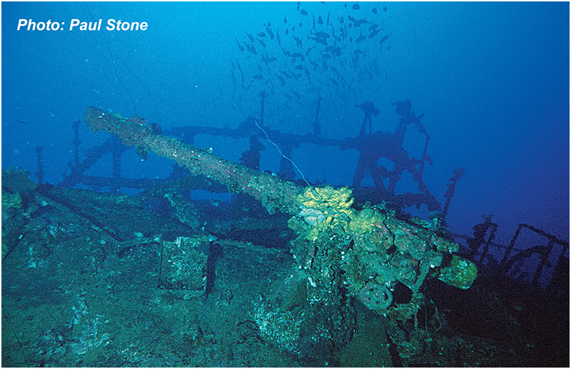 Above : Aikoku Maru’s stern antiaircraft gun still points towards the sky.