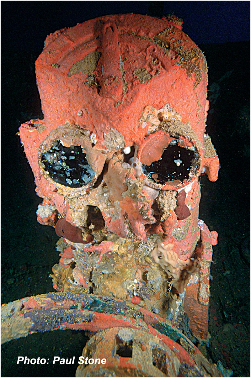 Below: Merchant ship’s gauges and telegraph encrusted with corals and sponges. |