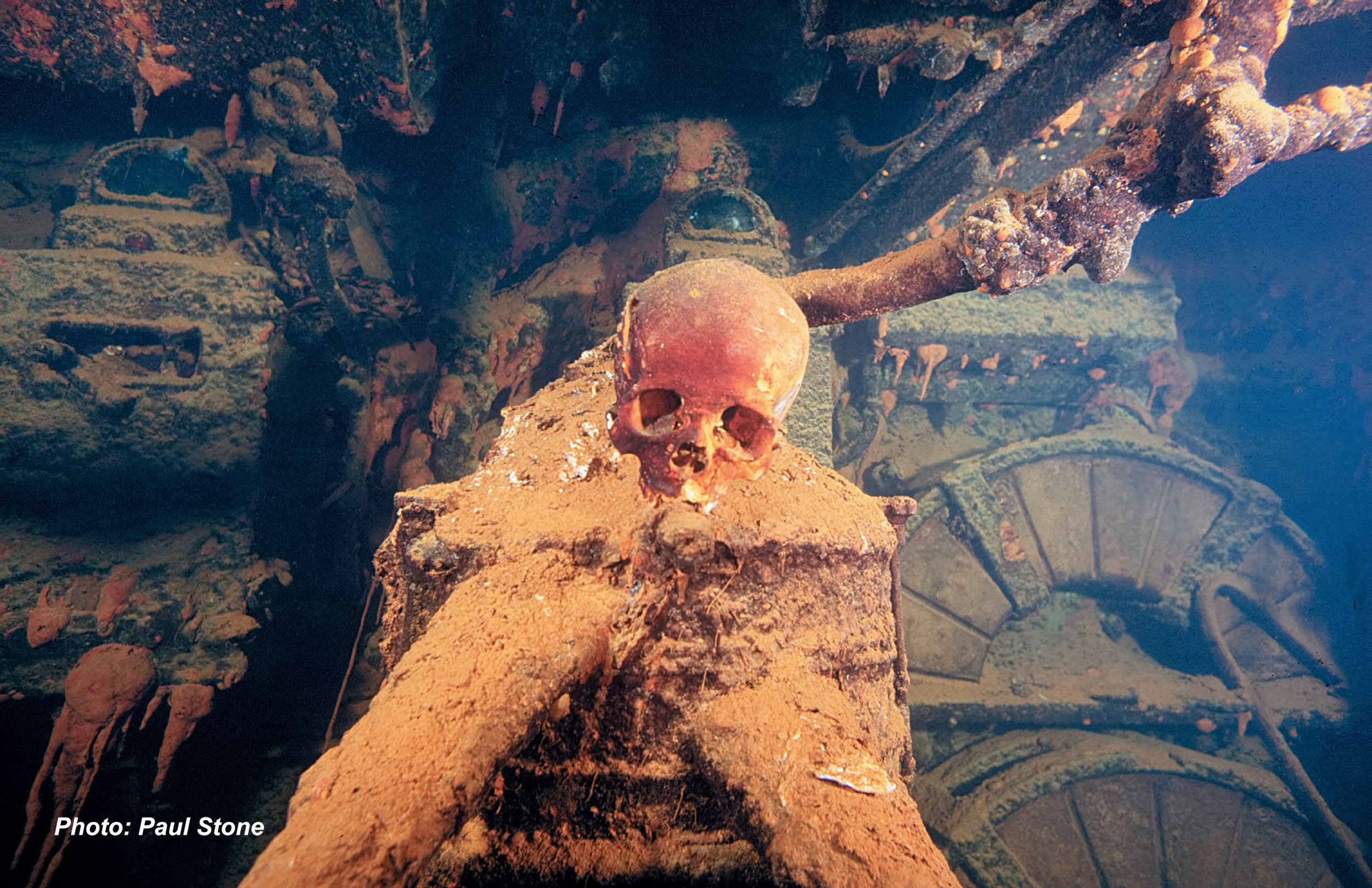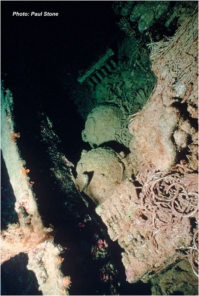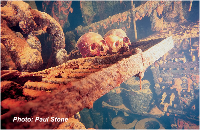 Above: Deep below deck in the far reaches of a ship’s hall ghostly human remains remind us of the consequences of war.