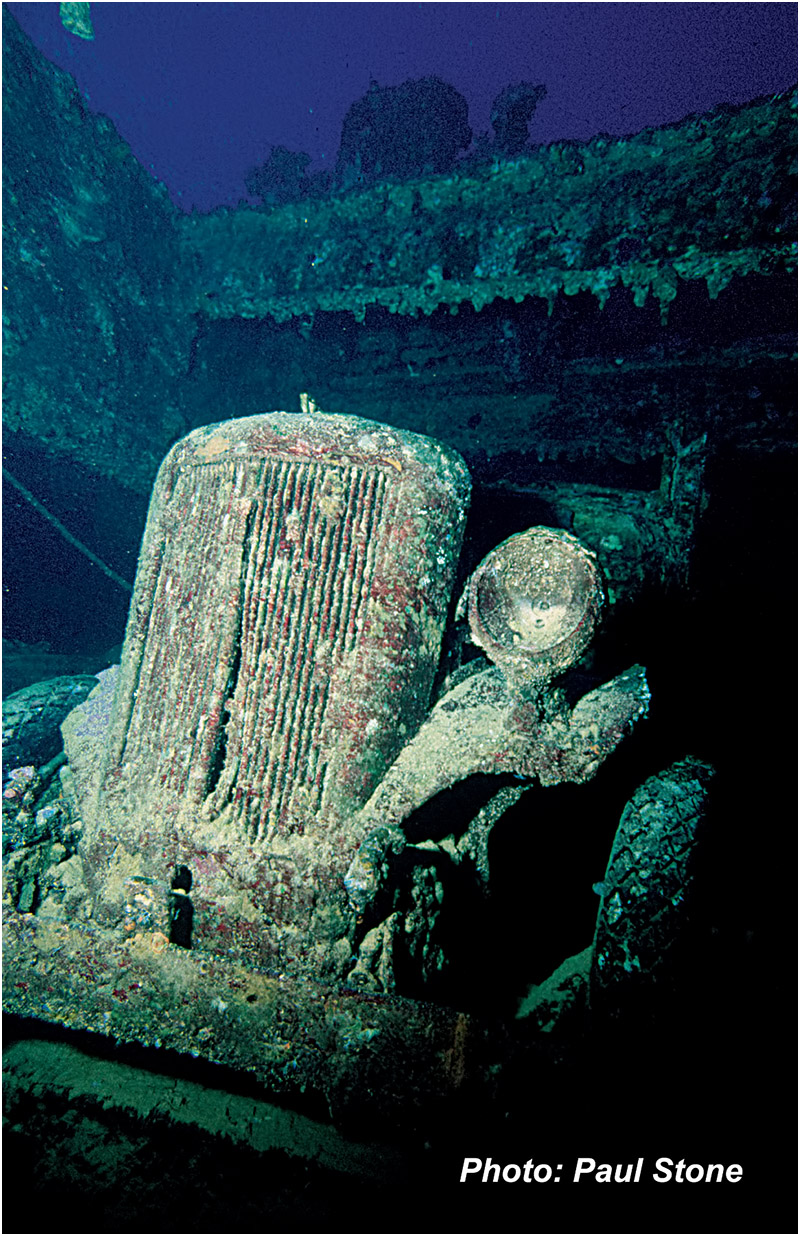 Below: Still locked to the decking this military transport vehicle is still fully loaded.