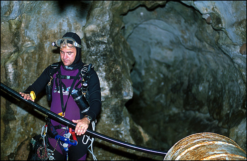 Below: Cave explorer and publisher of Advanced Diver Magazine, Curt Bowen climbs out of a small cave. |