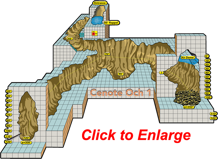 The second phase of the Yucatan 2001 expedition provided two outstanding discoveries: cenote Och 1 and cenote Tuchen. Cenote Och 1, located just outside the Village of Homun, started as a typical round cenote entrance with a 40-foot rappel to the water's surface. Explorer Jon Bojar completed the first solo reconnaissance sidemount dive into the system. Returning after 25 minutes to the surface, Jon described the giant cave passage as 20 to 40 feet wide and 80 to 100 feet tall with very dark walls. Advanced Diver's Curt Bowen grabbed another survey reel and his sidemount equipment and descended into the cenote. Continuing to the end of the line placed by Jon, the tunnel emptied into a very large junction room with the main tunnel continuing to the left. Peeling off the survey line, the large tunnel continued for another 200 feet until it ended in an immense room. This room measured 100 feet in diameter and 140 feet tall.