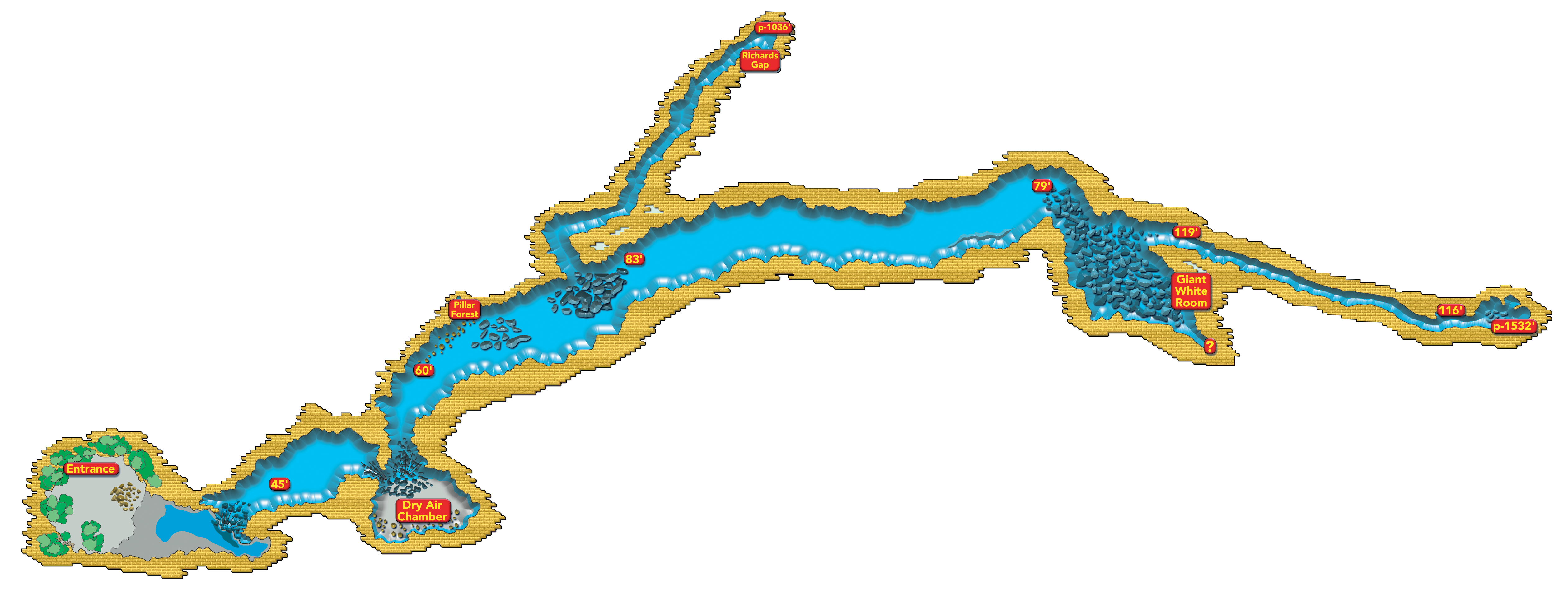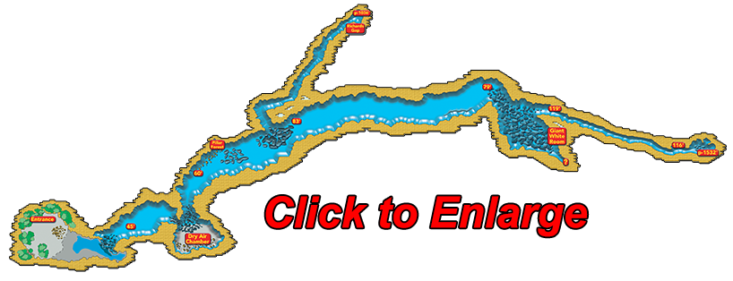 Cenote Tuchen (above map) was located down a dirt road several miles from Homun through the Yucatan jungle. This cenote's entrance drops 25 feet into a dry pit and into a large cavern zone. Jason Richards conducted the first reconnaissance dive and found an extremely large passage, impressive flowstone formations and a large dry air dome chamber. Passing the air dome, Jason reeled out knotted line down a massive tunnel leading deeper into the unexplored cenote. Once his exploration reel ran out of line, Jason returned to the exit with the news of his discovery.