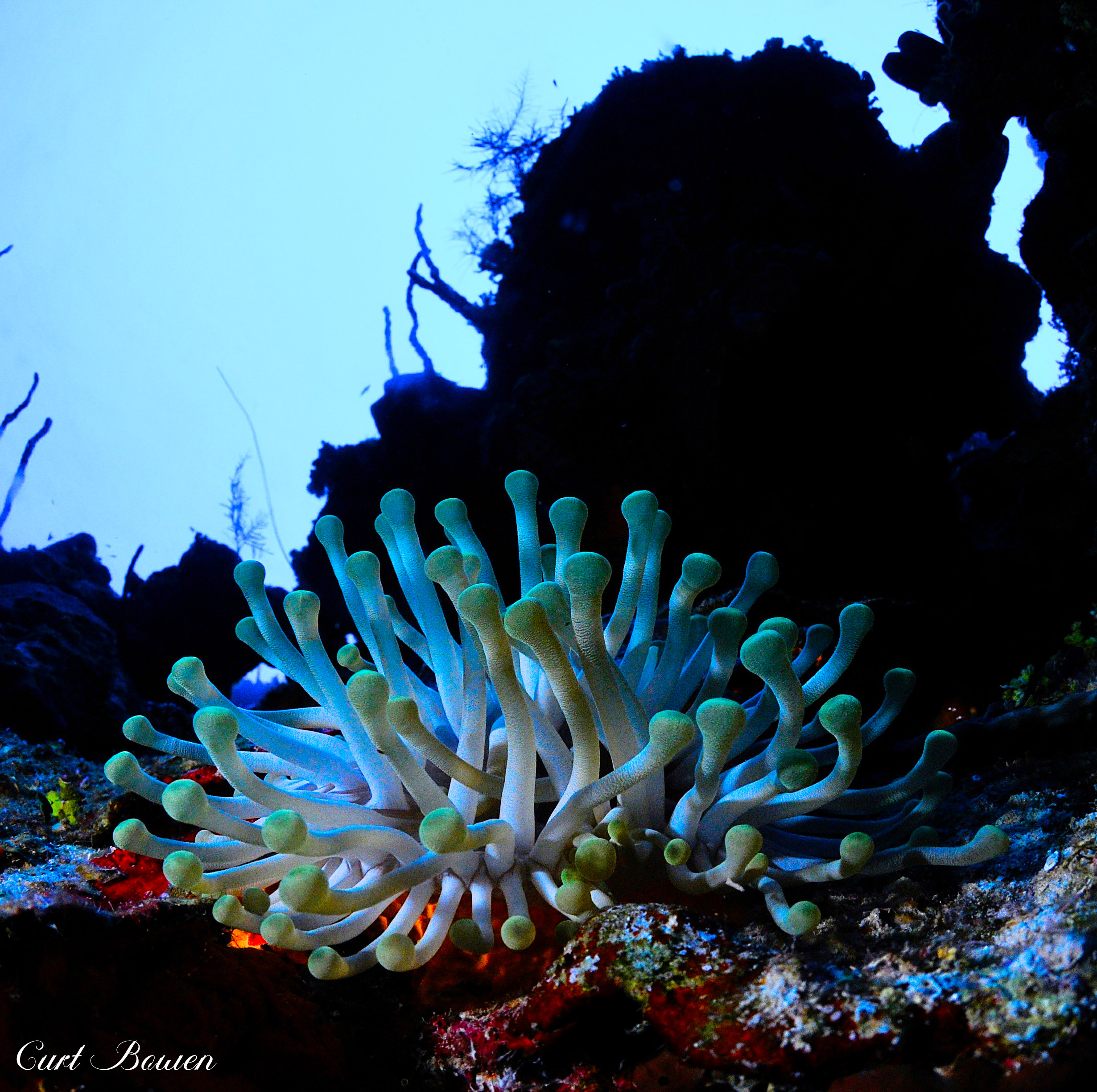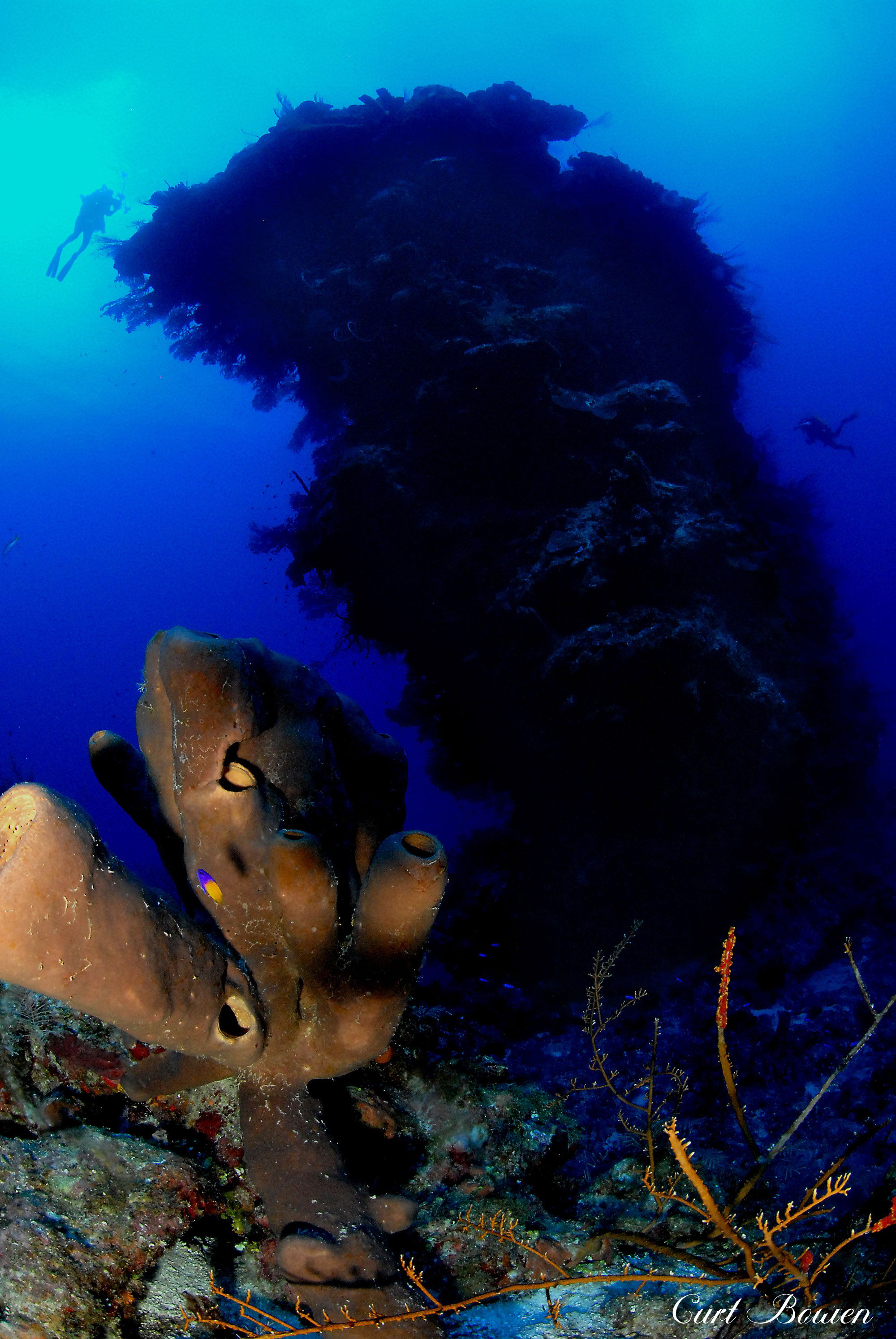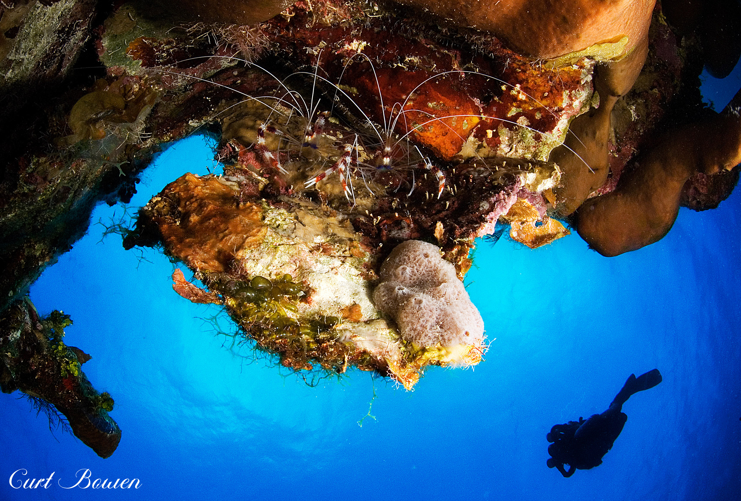 Holding your descent, you’ll notice the playful nudge of the placid current accompany you as you turn to observe the magnificent wall formations that curve sharply along the contour of the island. You’ll observe the strange and mysterious long arms of the black corals jutting away from their rocky anchors, bridging into the clear blue water. While noting how they oddly resemble the fruitless branches of autumn’s barren trees. Occasionally, a curious, lonely lobster will peek out to observe your presence, stretching out their antennas, keenly detecting your vibe as they purposely watch you swim past.