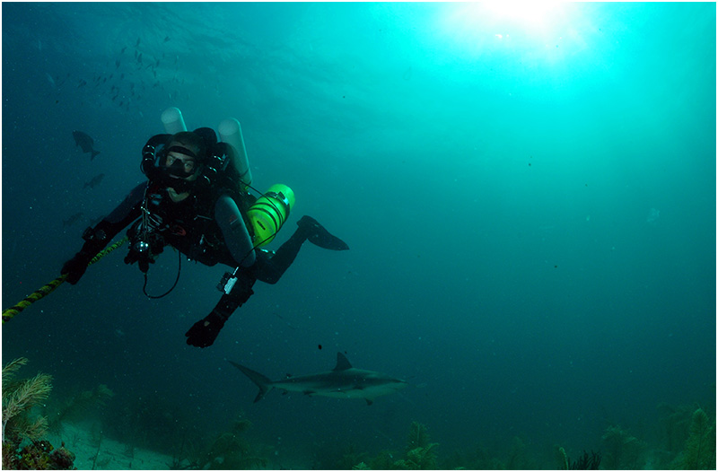 As I splashed in and descended to the pin, two blacktip sharks immediately surrounded me. Although the smaller of the two didn't bother me, it was the two-meter (six foot) long version that I kept an attentive eye on. Academically knowing that these sharks are generally wary of people did little to dull my attention.